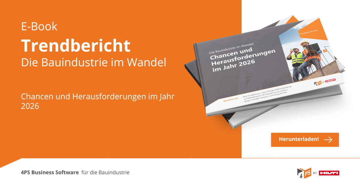 Die Bauindustrie befindet sich im Umbruch: Fachkräftemangel, steigende Anforderungen und geopolitische Unsicherheiten fordern neue Lösungen. Der 4PS Trendbericht liefert fundierte Einblicke in die wichtigsten Entwicklungen – von Künstlicher Intelligenz über Fertigbau bis hin zu resilienten Strategien.